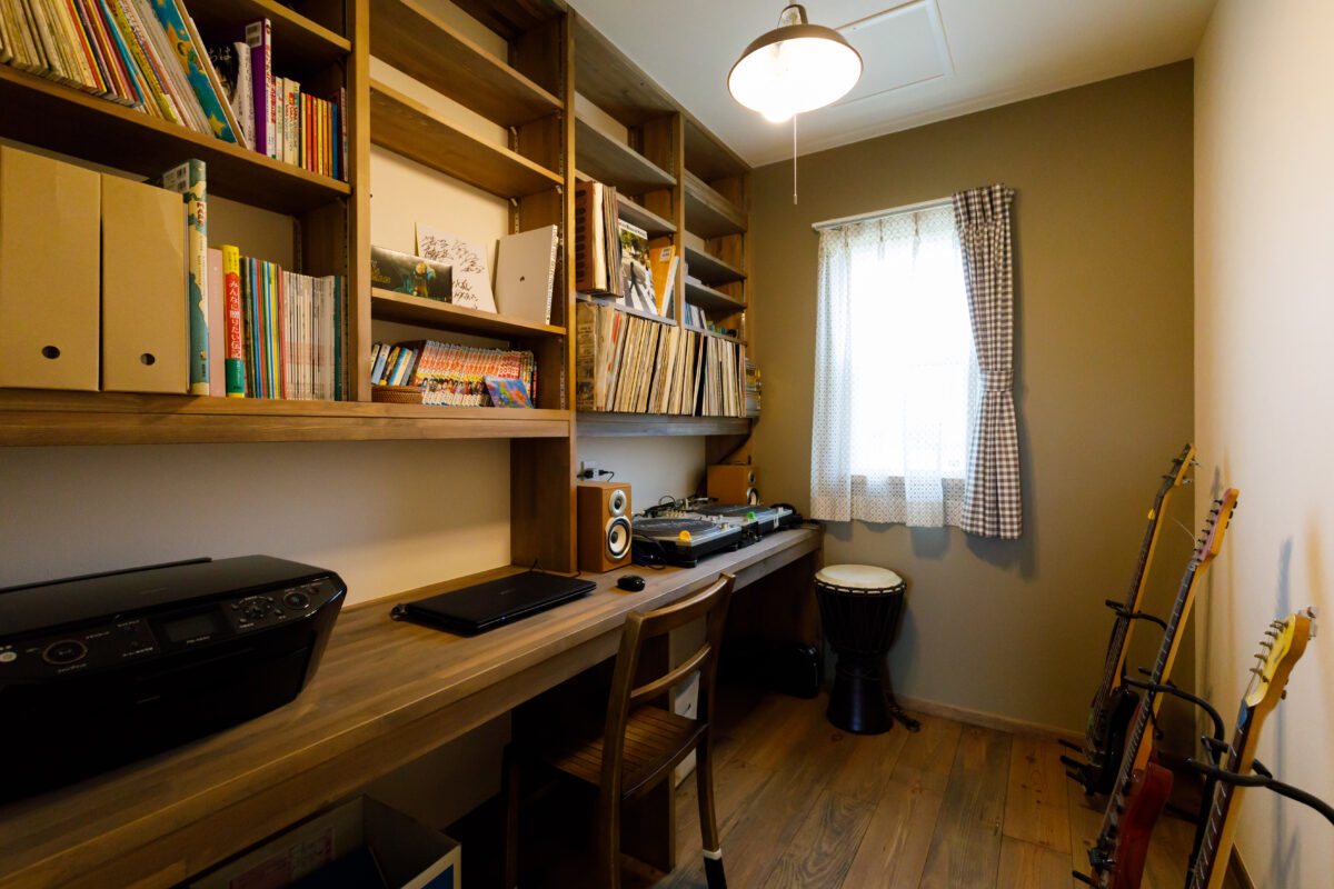 一方、ご主人様からは「趣味や仕事に没頭できる自分だけの空間」へのこだわりを伺いました。洗面と主寝室に挟まれた一番静かに過ごせるスペースにご主人様の書斎を儲けました。