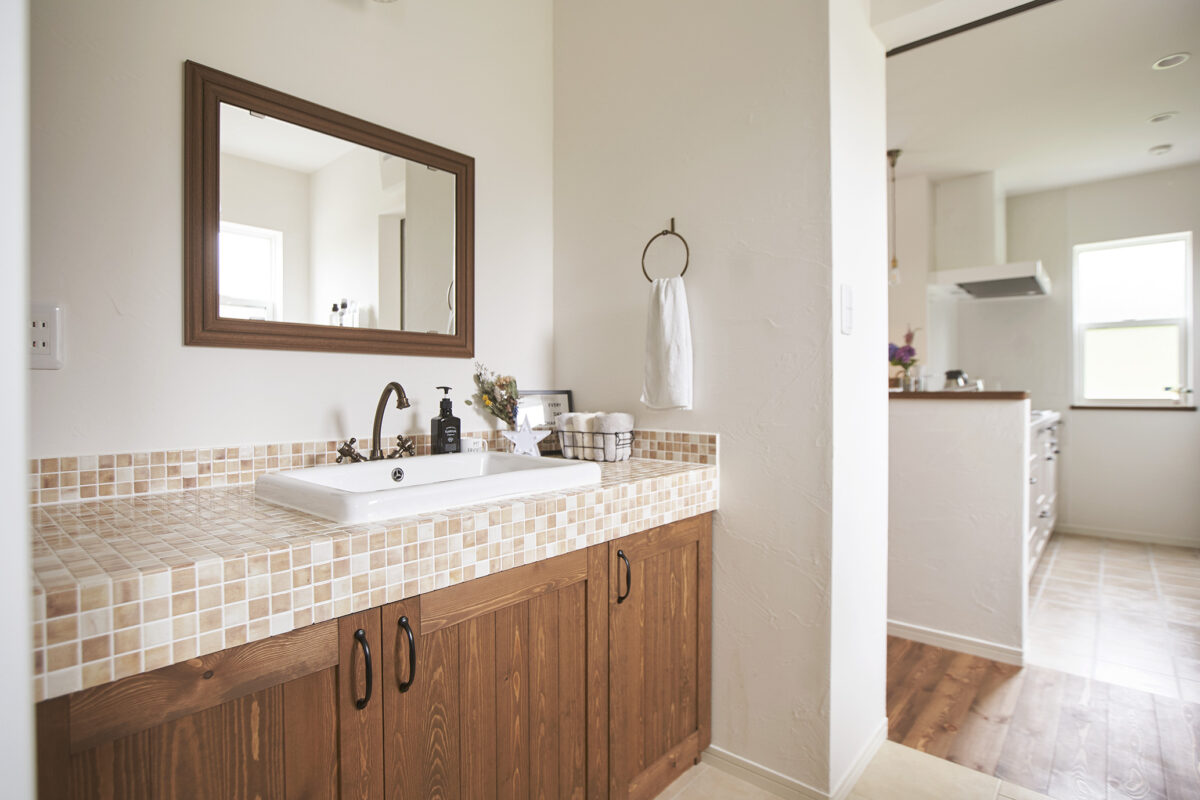 「可愛いだけではなく、暮らしやすさも妥協しない」というお二人のご要望に応えるため、家事の効率を上げる工夫も随所に盛り込んでいます。玄関からすぐに手が洗える動線や、洗濯物が室内で完結するランドリールームなど、日々の家事を快適にする設計です。