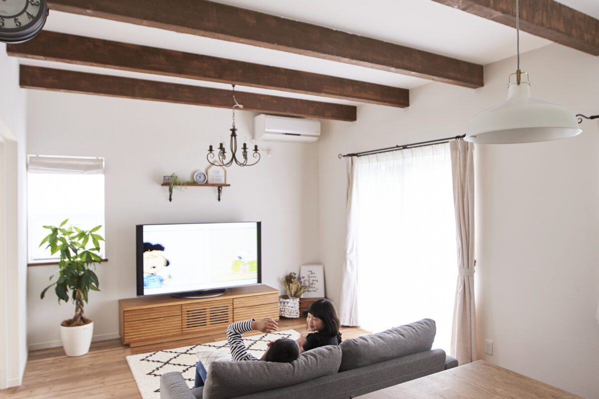 私たちが心を込めて設計したこの家は、陽光をたっぷりと取り込む大きな窓、温かみのある無垢材の床と梁が特徴です。