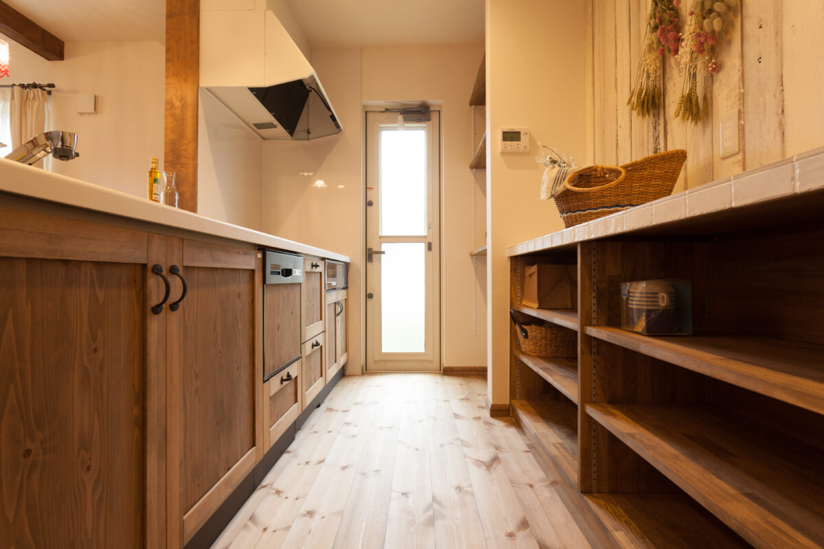 カントリー調の優しい雰囲気に包まれたデザインに加え、キッチンの背面には奥様お気に入りのアクセントクロスを施し、可愛らしい空間に仕上げました。また、キッチン台にはスパイスラックやコンセントを設置することで、調理のしやすさにも配慮し、毎日キッチンに立つのが楽しくなるような工夫を凝らしています。