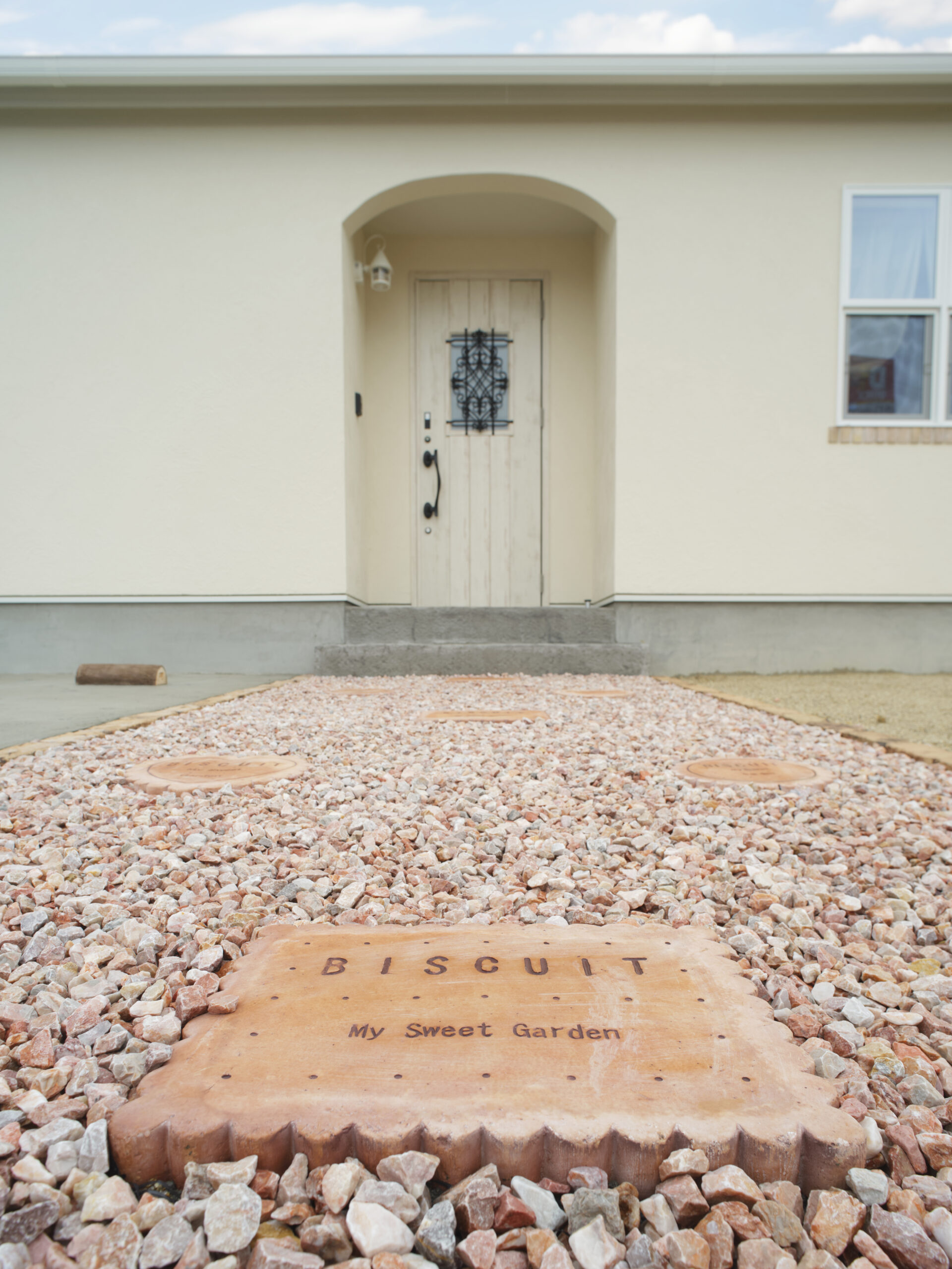 玄関まで続くアプローチには、ビスケット型の敷石があり可愛らしい♡♥♡ 敷石の表面に″BISUCUIT″ ”My Sweet Garden”と言う文字が刻まれていて 遊び心がいっぱい♪庭のアクセントにもなっています♬