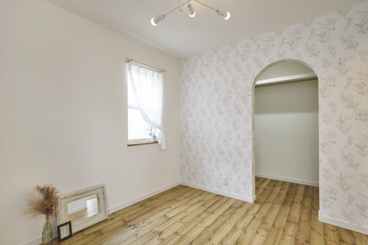 白を基調とした壁紙とボタニカルな壁紙の対比が可愛らしい主寝室。 まるでフォトスタジオのような空間が広がります。 丸いアーチ状のニッチが可愛らしいW・I・Cも完備!