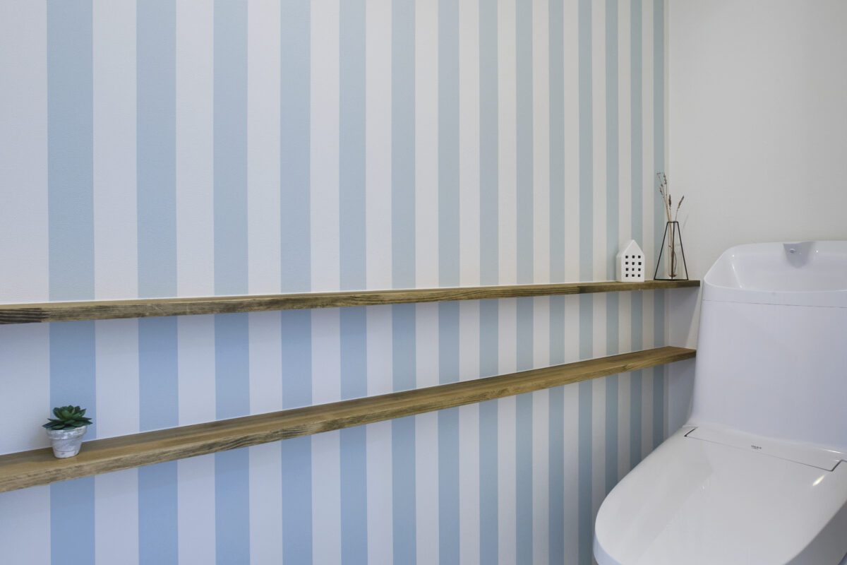 青と白のストライプのアクセントクロス。爽やかで清潔感があります。 木製のウォールシェルフには、お気に入りの小物や季節の植物を飾ったりできます。