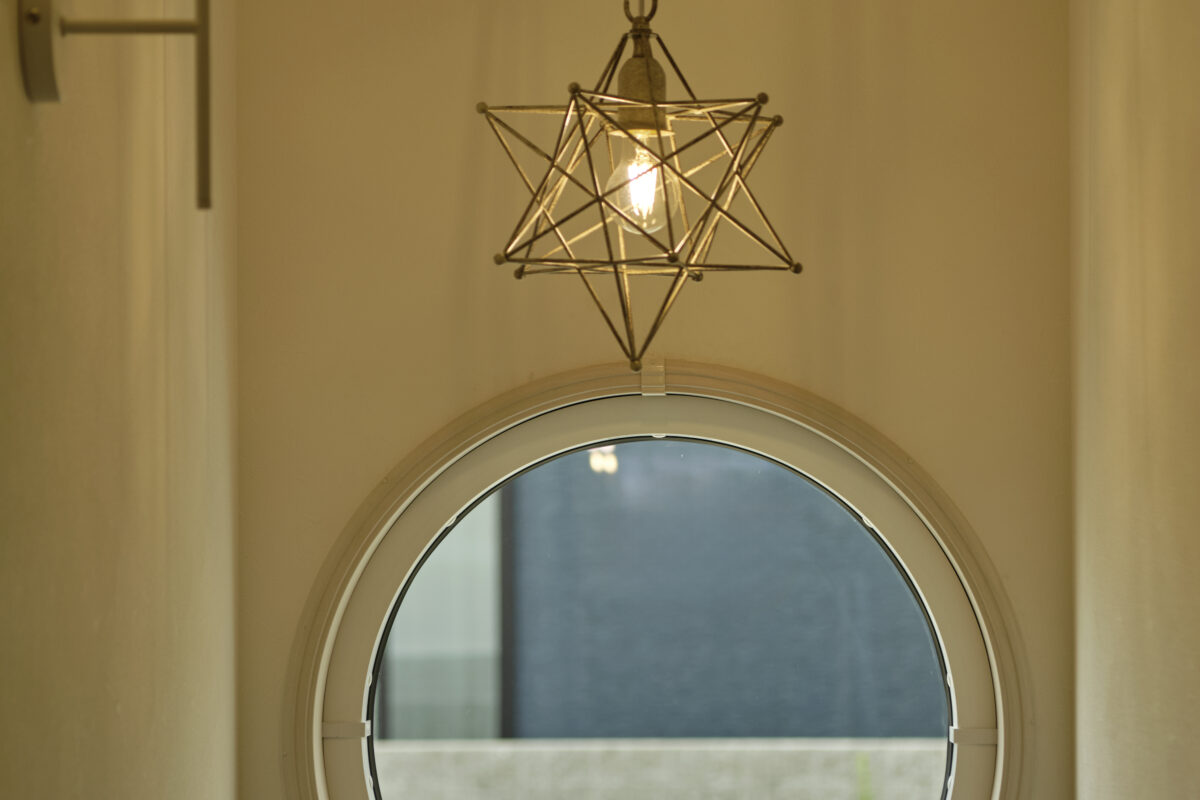 くすみがかったブルーのドアの小窓からはリビングの様子が見え、家族の存在が感じられます。